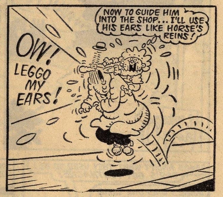 Among his most popular and longest-running comics in Buster were 'Clever Dick', 'Nellyphant' and 'Snooper'. 'Clever Dick' (7 February 1970-6 October 1979) centered on a young boy with genius I.Q. who made amazing inventions which never worked according to plan. It also ran in Whizzer and Chips and was later ghosted by Steve Maher and Baxendale's son, Martin Baxendale. 'Nellyphant' (28 October 1972-23 October 1976) was a gag comic about a goofy elephant and his zoo keeper, scripted by Derek Skinn. 'Snooper' followed the incurably curious title character who could never mind his own business and therefore always paid the price for it. After one year, it was also continued by Martin Baxendale.