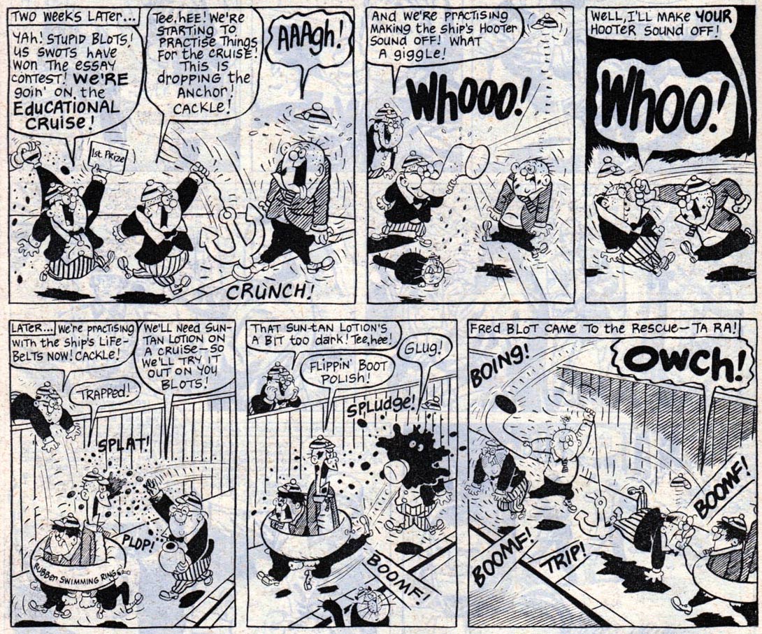 In January 1968, WHAM! had been absorbed by another Odhams Press title, POW!, which in turn was absorbed by SMASH!. Even though his previous work in SMASH! had been signed, Baxendale continued to work for the title anonymously until early 1971. This included drawing new episodes of 'Bad Penny' and 'The Swots and the Blots', but also creating the new horror-themed humor comic 'Sam's Spook' (1970-1971), about a schoolboy who receives help at dealing with bullies and other problems by a ghost called Spooky. In 1969, Baxendale also continued a humor comic about a group of rebellious children named 'The Swots and The Blots', originally created in 1966 by Ron Spencer and Mike Lacey, who obviously tried to copy Baxendale's own 'Bash Street Kids'. Since the series was already so similar to his own style, Baxendale had no trouble taking it over and making it his own. Some episodes were drawn by Les Barton and Terry Bave, but the majority was quintessential Baxendale. In 1971, SMASH! merged with Fleetway's Valiant magazine, where 'The Swots and The Blots' continued for another couple of years.