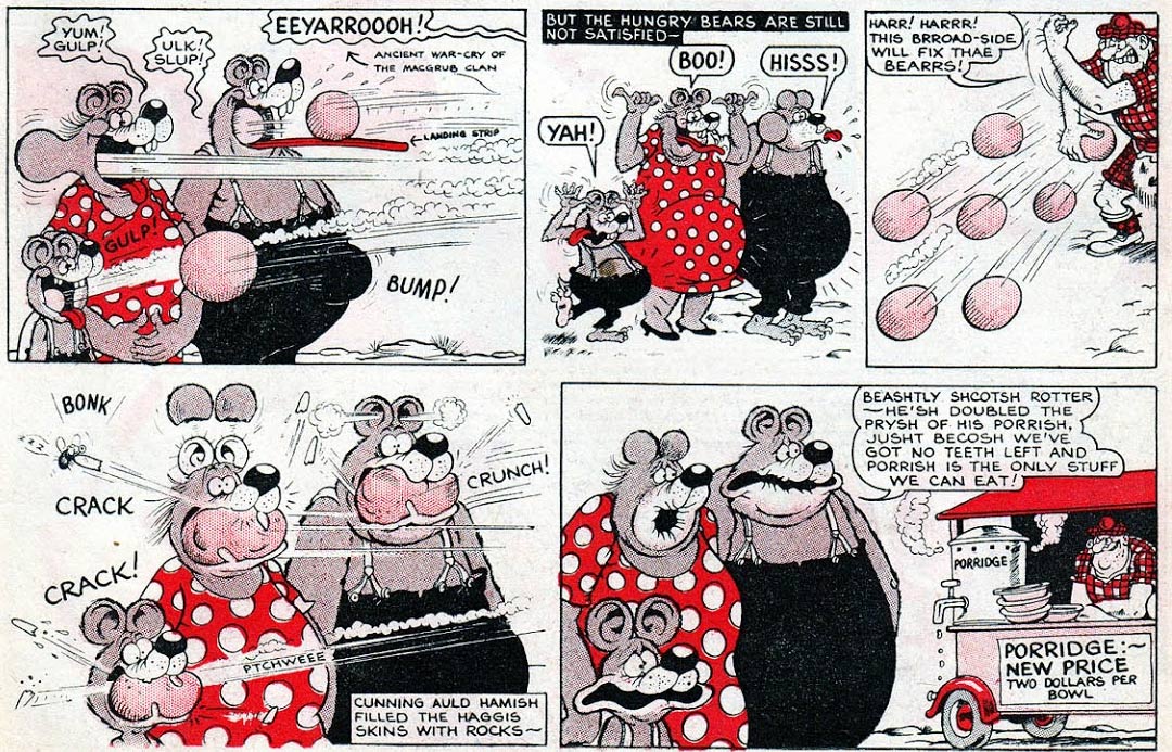 Baxendale's final classic series for The Beano was 'The Three Bears' (1959), a spin-off of 'Little Plum'. First published on 6 June 1959, it starred a grizzly bear family - Pa, Ma and Little Teddie - inspired by the Joseph Jacobs fairy tale 'Goldilocks and the Three Bears'. Many episodes center on the family's never-ending search for food. They always try to outwit shopkeeper Hank, a local sheriff and two rival bears, Grizzly Gus and his son Gus's Grizzly. When Baxendale's workload became too heavy, 'The Three Bears' was the first series he dropped, passing it on to Bob McGrath, who drew it for several decades. In 1985, the comic was briefly discontinued, but it returned with irregular intervals drawn by Tom Lavery, Bob Dewar, David Parkins and Robert Nixon. Between 1999 and 2007, it made its definitive comeback in The Beano's pages, drawn by Mike Pearse until in 2002 he passed the pencil to Chris McGhie. The bear family returned one final time between 2010 and 2011, drawn by McGhie, David Parkins and Ken Harrison.