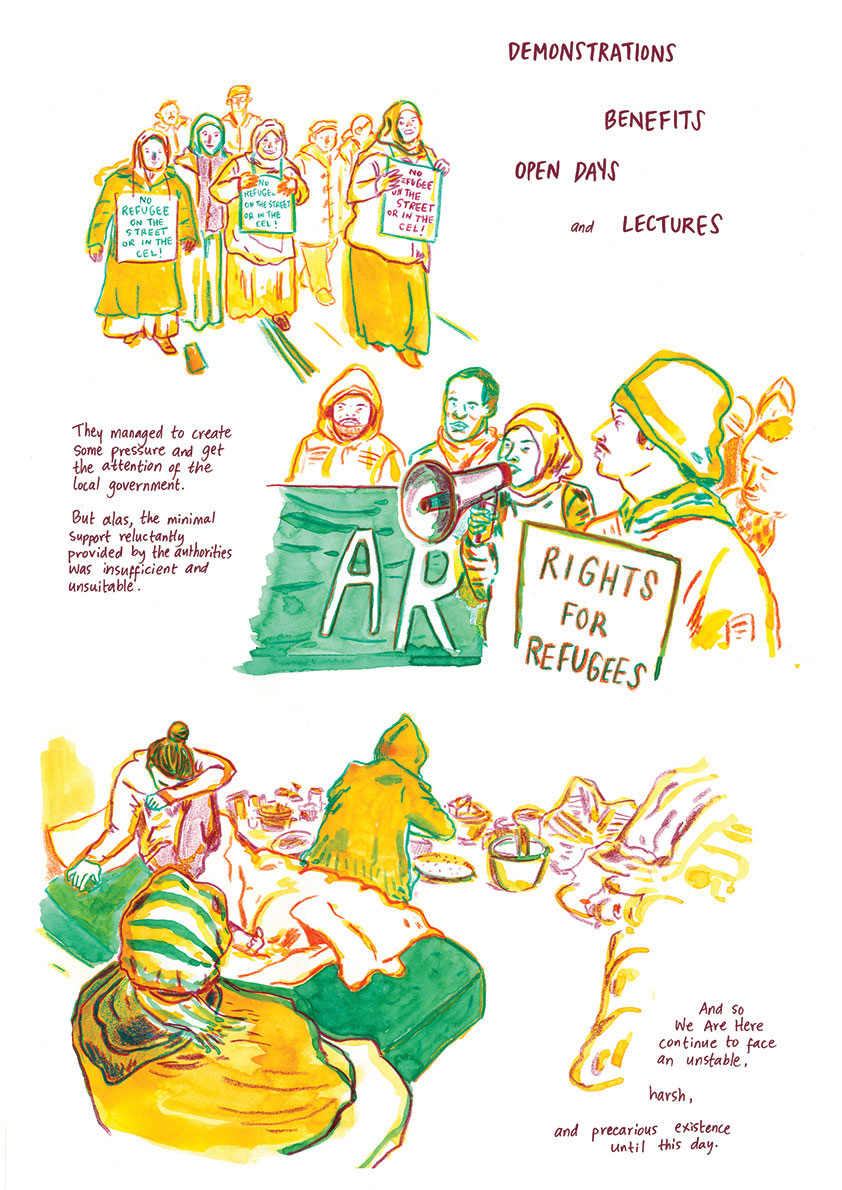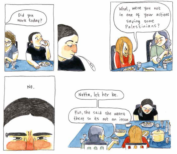Carrot's short comic stories have appeared in magazines and zines, and on the online platforms Pulp de Luxe and Drawing The Times. Some focus on local issues. 'We Are Here' (Drawing the Times, 2018), for instance, deals with a self-organized group of refugees in Amsterdam's Rapenburg neighborhood. 'Born Optimistic' was her contribution to 'Stories from Overvecht' (2020), a collective documentary project initiated by Het Huis van Betekenis, portraying residents of the Overvecht district in Utrecht. Her fiction stories are also socially engaged. The self-published 'Friday' (2017) tells the story of an Israeli pro-Palestinian activist, who joins her family for a traditional Friday dinner after demonstrating in the West Bank. The story was picked up by the Pulp de Luxe platform in the following year.