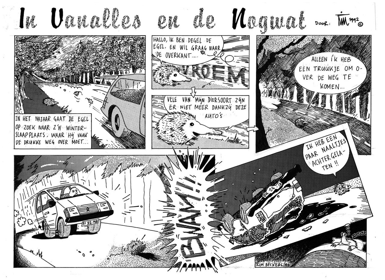 'In Vanalles en de Nogwat' (De Natuurgids, 1992). The hedgehog uses some of his quills, so he can safely cross the road.