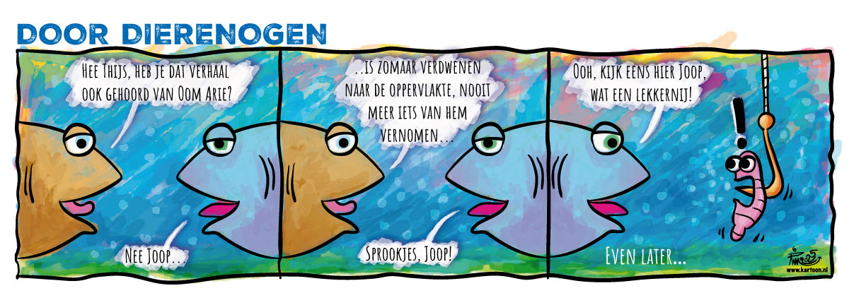 'Door Dierenogen' (De Natuurgids, 2025). Translation: "Hey, Thijs, have you also heard that story about Uncle Arie?" - "No, Joop." - "He suddenly disappeared to the surface. Never heard anything from him again." - "Fairy tales, Joop!" - (Some time later) "Oh, look here, Joop! What a delicacy!".