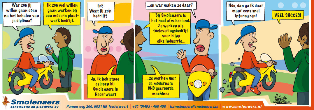 In addition to his daytime job, Rim Beckers has been making illustrations and comics for various clients, most notably advertising strips for Limburg entrepreneurs. De Natuurgids, a special interest periodical about nature, environment and local history in Limburg, has regularly published his work. His contributions include the 1990s nature trivia feature 'In Vanalles en de Nogwat', the comic strip 'Frits' (2008), about a house rabbit, and 'Door Dierenogen' (2025- ), which gives a humorous look through the eyes of animals. In addition, Beckers has been creating 'LinkedIn Strips', a series of comics with caricatures telling stories by his LinkedIn connections.