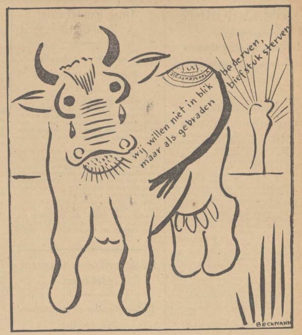 During World War II, Beckmann was one of the illustrators for the Kabouterboekjes ("Gnome booklets"), a series of small-format children's picture books (12x8 cm) published by department store De Bijenkorf around 1943. Most of the booklets were based on existing fairy tales. The texts were written by Sjoert Schwitters (who was executed by the Nazi oppressors on suspicion of communism in early 1945) and among the other illustrators of the series were Henk Kabos, Hans Brouwer, Lex Metz and Toby Vos. Beckmann was responsible for the illustrations of 'Roeland, Het Lelijke Rupsje' ("Roeland, The Ugly Caterpillar", booklet #4), 'Cecilia, De Circuspop' ("Cecilia, The Circus Doll", booklet #10) and 'In Het Poolijs' ("In The Polar Ice", booklet #14). Notable about the collection is that the stories are told in the comics format, and even feature speech balloons.