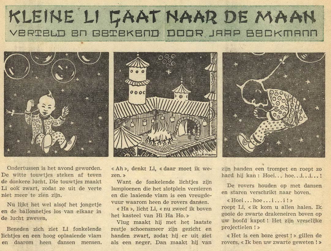 Another comic strip by Beckmann was 'Kleine Li Gaat Naar De Maan', about a little Chinese boy who makes a voyage to the moon. The story is presented in the text comic format, with narration appearing underneath the images. It is unknown in which Dutch newspaper this text comic ran, but in 1950 it was serialized in De Kleine Zondagsvriend, a Sunday children's supplement in the Flemish newspaper De Zondagsvriend.