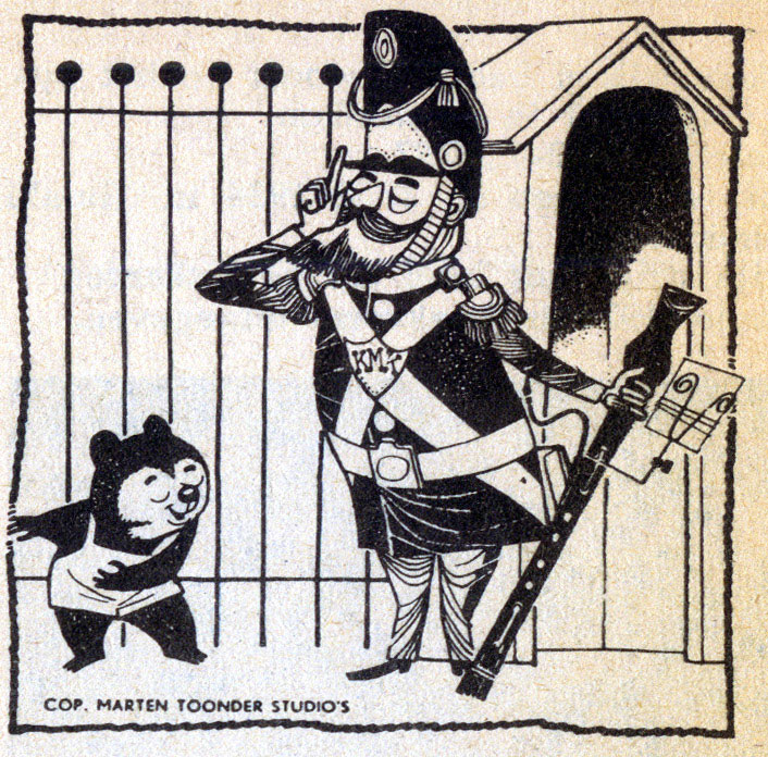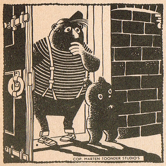At the Toonder Studio's, Ton Beek was also the artist of the funny animal newspaper 'Birre Beer', which ran in the newspaper Algemeen Handelsblad between 27 December 1954 and 28 March 1959. Created and written by Marten Toonder's wife Phiny Dick, the comic stood out graphically for Beek's distinctive drawings with stylized black-and-white. A week before its publication, the editors introduced their upcoming comic star Birre Beer as "the son of Mary Tourtel's 'Rupert Bear', whose adventures had appeared earlier in this newspaper. The 'Birre Beer' text comic told the adventures of a little bear named Birre whose naïvité always gets him in trouble. He is a good friend of Mirre, the daughter of a woodsman, and Socratov the mouse, who both frequently help him out whenever the need is highest. The first episodes of the strip were written by Dick, later episodes were written by Andries Brandt and Eiso Toonder