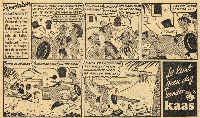 Through the Toonder Studio's, Ton Beek also worked as an artist on many advertising comics, most notably 'De Avonturen van Klaas Volvet en zijn Knechtje Plus', about a chubby cheesemonger and his helper, who go on a treasure hunt around the world. A promotional strip for cheese published in newspapers like Algemeen Handelsblad between April 1954 and October 1955, the 'Klaas Volvet' strips were also collected in two booklets by the Dutch Dairy Agency (Nederlands Zuivelbureau).
