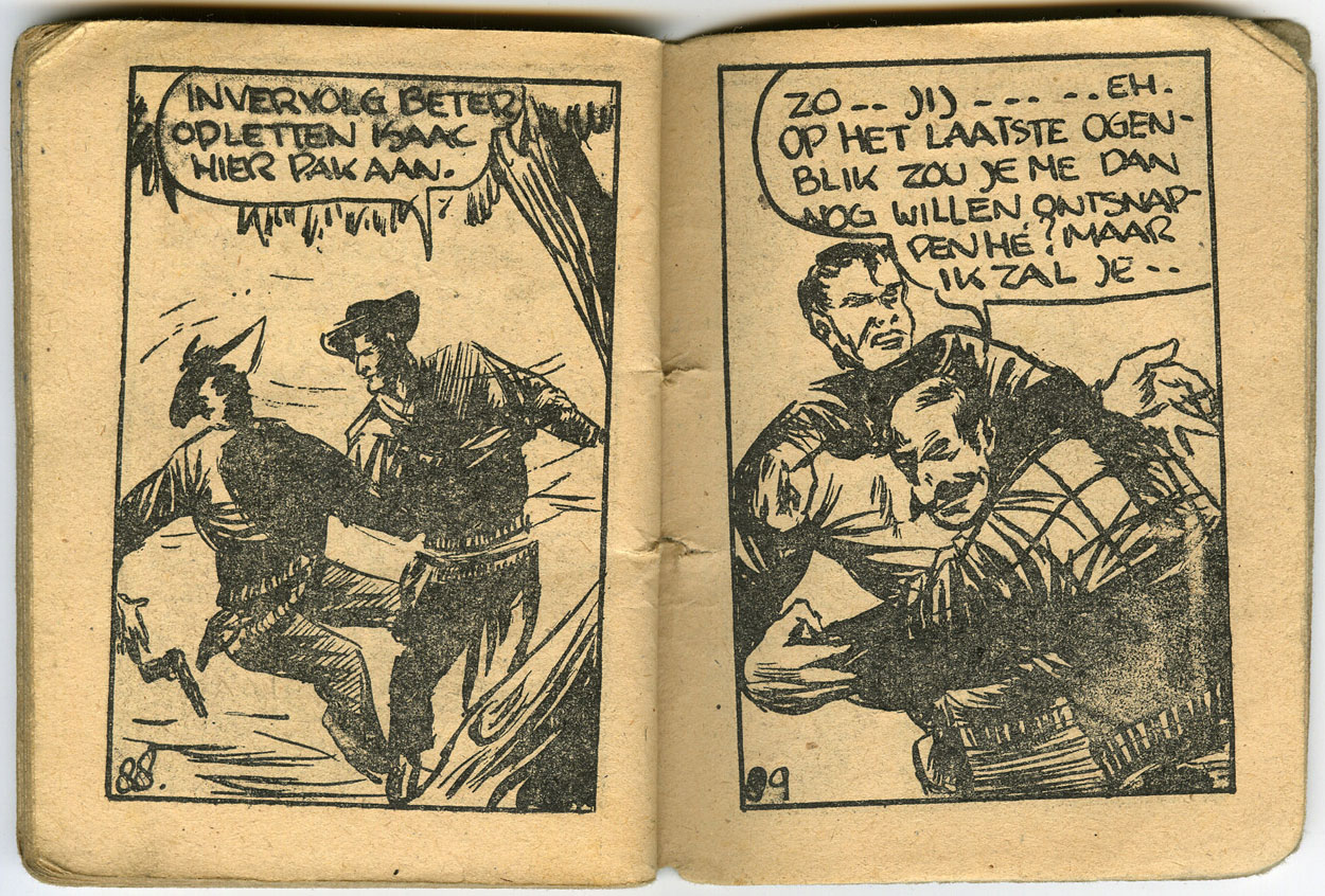 In the early years after the Second World War, Van Beek steadily enlarged his client list, often with help from Henk Albers. In 1947, he joined his friend at H.A.T.E. (Hoenderopse Algemene Tijdschriften Exploitatie), one of several publishers of so-called "beeldromans". The market for these digest-sized pulp comics blossomed in the wake of Alfred Mazure's success with 'Dick Bos'. While Albers created the masked vigilante 'De Kat' (1948), Albert van Beek succeeded Willy van Dael on the western series 'De Zwarte Ruiter' (1947-1948). Taking over from issue #2, Van Beek worked on six issues until he was drafted for his military service. The final issue of 'De Zwarte Ruiter' was finished by Henk Albers. In 1949, Van Beek also worked for the Rotterdam comic paper Ketelbinkie Krant, making editorial illustrations with Wim Meuldijk's comic characters Ketelbinkie, Sneeuwvlok and Piet Palet. Among his other work from this period were illustrations for Avrobode magazine, large coloring pictures for Radio-bode and much advertising work, for instance painting movie announcements for cinemas through the Rabach agency.