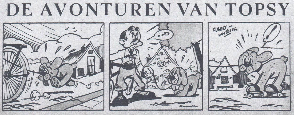 Van Beek's longest-running feature was the text comic 'De Avonturen van Donny en Ronny' (1946-1947), of which two stories were made. In their first adventure, starting in newspapers like De Graafschapper on 10 May 1946, the two kid friends Ronny and Donny go on a treasure hunt. In October, serialization started of the second episode, in which the two boys accidentally end up on a ship sailing to Africa. There, they team up with the detective Mac Brekum to search for the missing explorer Iksie Wajijnisie. For the women's magazine Cinderella, Albert van Beek made the obscure comic strip 'De Avonturen van Topsy' (1946), about a little dog. Between 5 December 1946 and 21 August 1947, Van Beek's comic serial about 17th-century cabin boys, 'Naar Zee', ran in the newspapers.