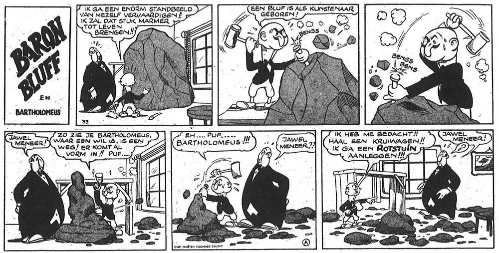 Along with Frits Godhelp, Van Beek also drew episodes of the gag feature 'Baron Bluff en Bartholomeus' (1948-1949) for Tom Poes Weekblad, about a not-so-smart baron and his butler. These strips were signed "Marten Toonder". Apart from Tom Poes Weekblad, the 'Baron Bluff' gags were also syndicated to the Belgian publications Kleine Zondagsvriend and Het Laatste Nieuws. In the early 1960s, another feature with the name 'Baron Bluff' was drawn for the Toonder Studio's by Jan van Wensveen, and printed in several regional newspapers. Besides the title, it was unrelated to the original 'Baron Bluff' strip.