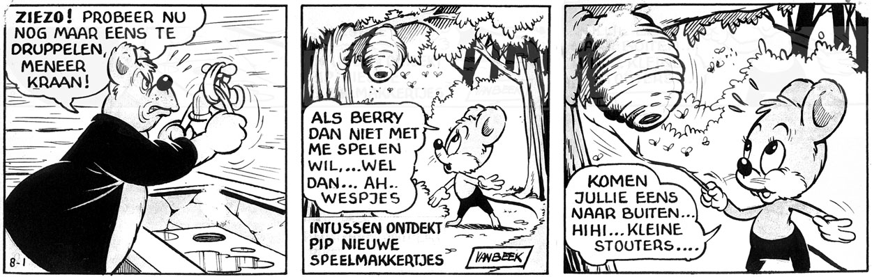 Working for the Toonder Studio's also gave Van Beek and the other studio workers permission to stay in the Netherlands, instead of being sent to Nazi Germany to work in the war industry. Earning three guilders a week, Van Beek was drawing Marten Toonder's 'Tom Poes and Olivier B. Bommel' ('Tom Puss and Lord Bumble'), probably for merchandising purposes, and participated in the production of 'Das Musikalische Auto', an advertising film commissioned by the German production company UFA. In early 1945, Van Beek developed his own comic strip for the Toonder Studio's, 'Pip en Berry', starring a mouse and a bear. The comic however never went into circulation.