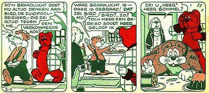 Around 1948, Van Beek returned to the Toonder Studio's, although this time as a freelance artist. He participated in the artwork of Marten Toonder's newspaper comic 'Kappie' (specifics unknown), and also worked on a balloon comic with Toonder's signature character, Olivier B. Bommel (Lord Bumble). Written by Waling Dijkstra, Van Beek made the drawings for the story 'Heer Bommel en de Hollebosser Knol'. Serialized in Tom Poes Weekblad (25 August 1950-2 March 1950), Ons Vrije Nederland (27 August 1949-28 January 1950) and Kleine Zondagsvriend (19 January-22 June 1950), this is the only 'Bommel' story without Tom Puss, a character Van Beek hated dreadfully.