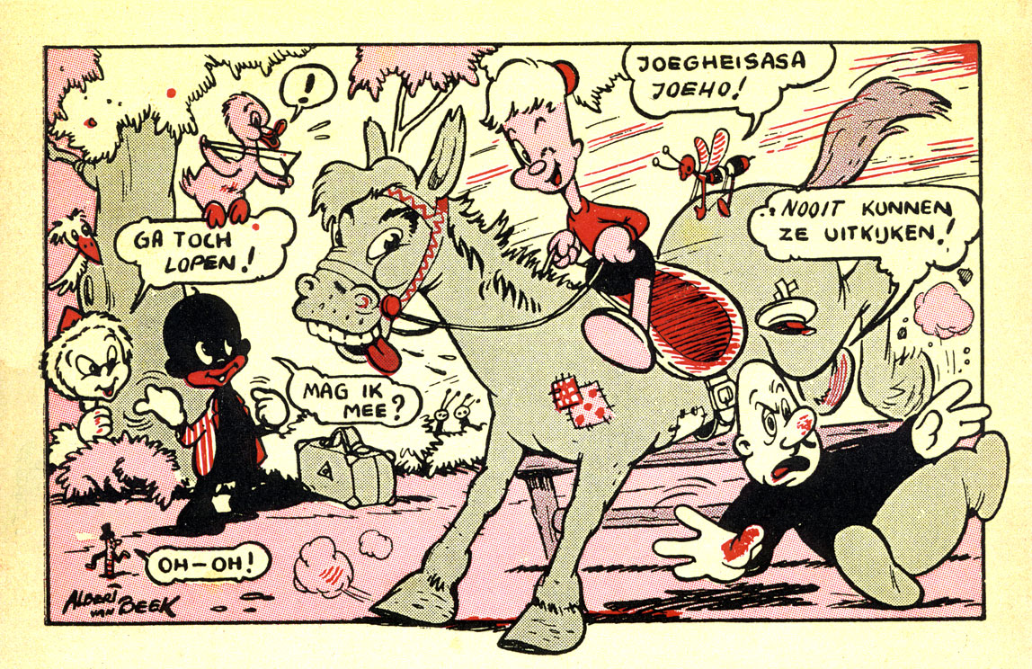 Albert van Beek and Henk Albers continued to work together up until 1950. At one point they shared a studio on the Amsterdam Muntplein. Already during World War II, they illustrated picture books for the local publisher Mulder, intended for publication after the war. Mostly written by Hans Nije, these picture books have however never seen print. During the final months of World War II, the Toonder Studio's were closed, and Van Beek joined his uncle in going from door to door to sell herbs and spices. Shortly after the Liberation, Van Beek briefly worked for Joop Geesink's puppet animation studio, designing flyers and posters.