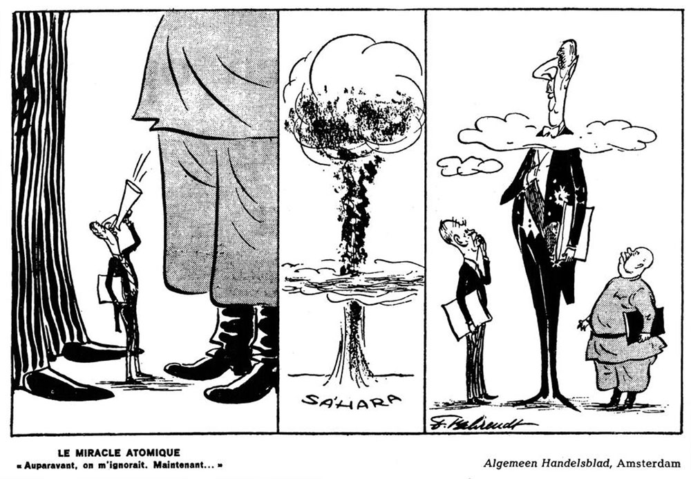 Cartoon about the first French nuclear test in 1960, which made France (caricatured as Charles de Gaulle) an atomic power on the level of the two other countries with atomic weapons: the U.S. (caricatured as Dwight D. Eisenhower) and Russia (caricatured as Nikita Khrushchev.) Algemeen Handelsblad, 1960.