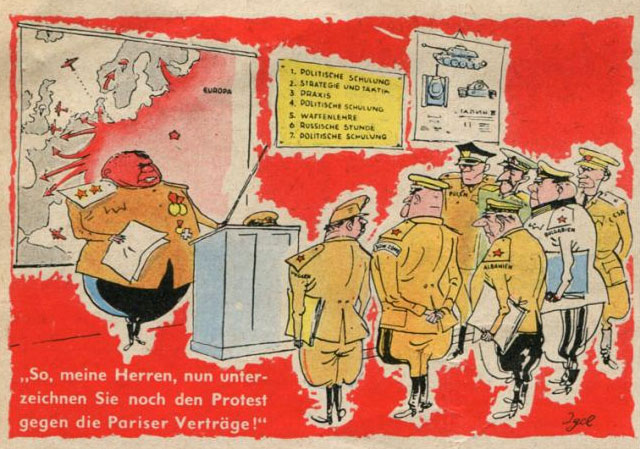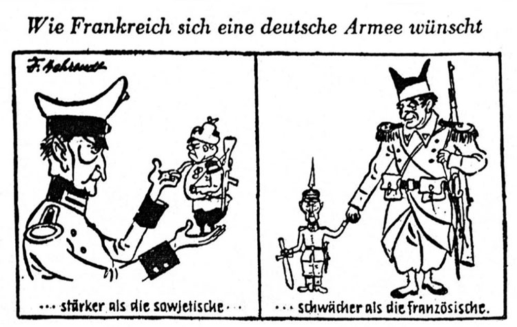 Cartoon about German rearmament, printed in the German magazine Die Welt (27 September 1954). Translation: "How France wants the German army to be: stronger than the Soviet one, weaker than the French one." The man in German uniform is West German chancellor Konrad Adenauer, while the man in French uniform (right) is French President René Coty.