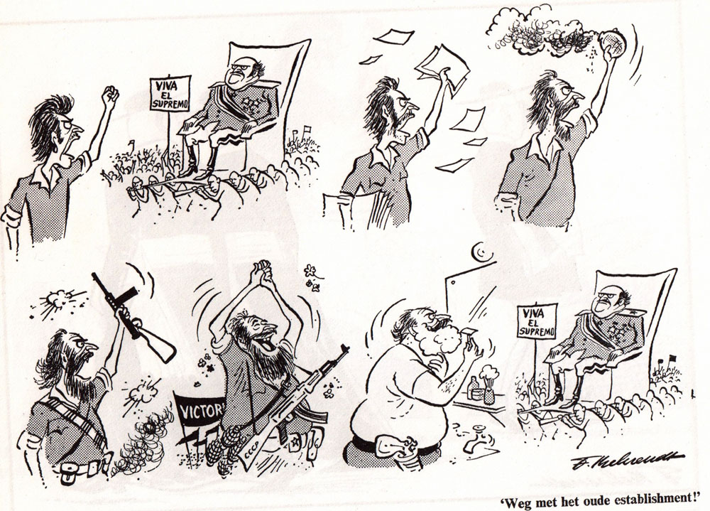 Fritz Behrendt contributed cartoons to publications by the Dutch environmental organization Milieudefensie, Amnesty International, the Evangelist Church of Germany and a foundation supporting widows of the 1995 Srebenica Massacre during the War in Former Yugoslavia (1991-1995). In 1985, he was one of several cartoonists to support Dutch comic artist Wim Stevenhagen, who was convicted for his refusal to fulfill his military service for reasons of principle. His and more graphic contributions were collected in the book 'Tegenaanval' (De Lijn, 1985). Starting in 1962, Behrendt was also a familiar face to Dutch TV viewers, presenting his "graphic commentary" in current event-related TV broadcasts.
