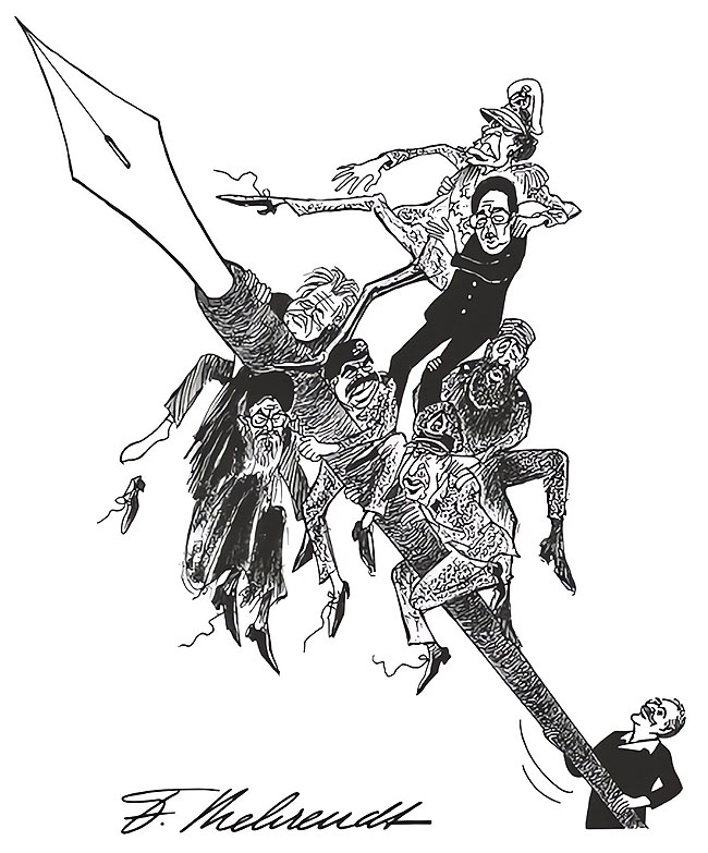 Self-portrait, balancing various dictators on his pencil. On top Muammar Ghadaffi, being held by Kim Jong-Il. One row beneath appears Slobodan Milosevic, and in the row below ayatollah Khamenei, Saddam Hussein and Fidel Castro, with Augusto Pinochet beneath.