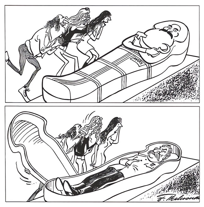 Still, Behrendt also acknowledged that divisions between Israeli and Arab fanatics were the real root for much of the bloodshed in the Middle East. One of his cartoons depicted the graves of a Palestinian and an Israeli, with the subtitle: "Finally peacefully next to each other." Another iconic drawing portrays an Israeli soldier and Palestinian militant staring at each other with suspicion, while their children happily play with each other. The subtitle reads: "Hope…" On the same token, Behrendt made several cartoons criticizing the U.S. government, capitalism, the Western war industry, racism and even intolerant conservatives who erroneously claim that "things used to be better in the past." Behrendt always sympathized with the average citizen, victimized by oppression, torture and execution, regardless what country they lived in. As he explained in his own words: "I'm a fierce opponent of patented recipes to change the world with violence. The cynicism of Soviet leaders is just as horrid to me as the icecold materialism of industrial mandarins, whose anti-communism has a suspicious smell."