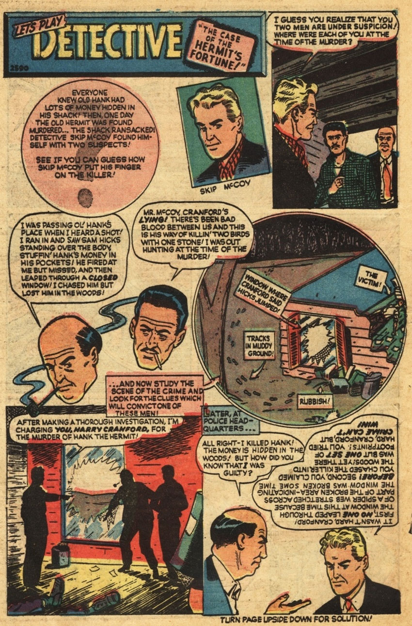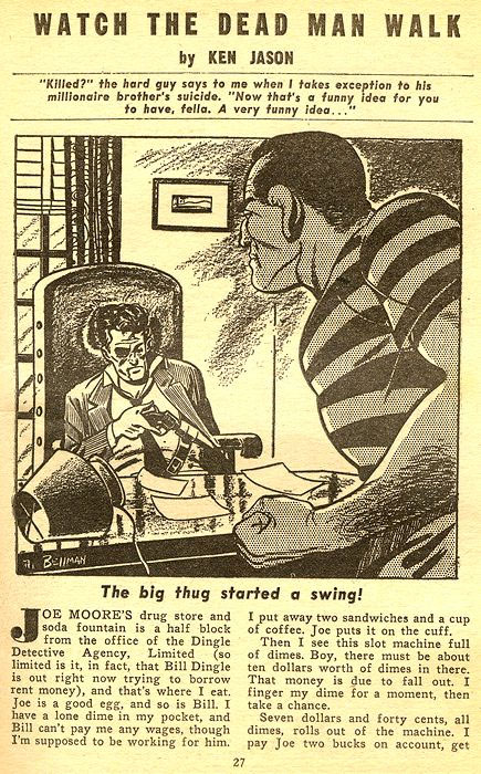 On the side, Bellman made illustrations for the company's romance and crime pulp books, such as 'Love Story' and 'Detective Short Stories'. As a freelancer, he also contributed his own riddle comic 'Let's Play Detective' (1943-1949), which appeared as a filler feature in several of the Timely comic books. In the second half of the 1940s, he drew stories with Navy lieutenant 'Jap Buster Johnson', at least one written by none other than the future crime novelist Mickey Spillane. By the time World War II was over, the popularity of superheroes waned, and comic book companies turned to genre-based anthology titles. So did Timely, who regrouped its activities into Stan Lee's Atlas Comics line in 1951. Bellman remained involved during the early years, contributing to the romance, western, crime and sports titles. One of the final regular features he worked on was 'Captain Jet Dixon of the Space Squadron' (1952) in Space Squadron and Space Worlds. Between 1950 and 1953, he also contributed some stories to the comic books 'Crime and Punishment' and 'Lover's Lane', published by Lev Gleason.
