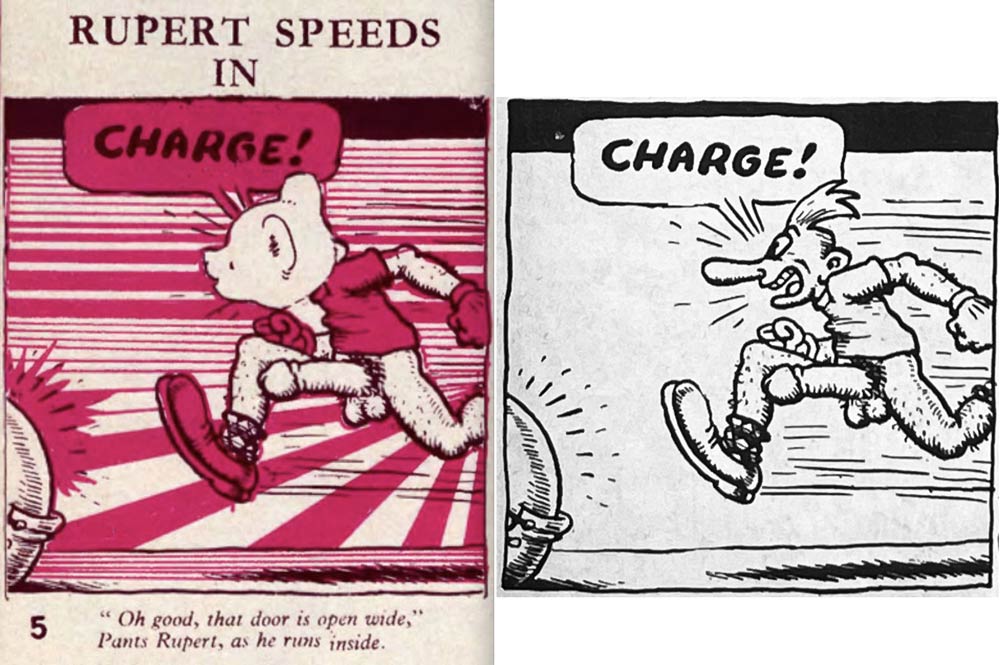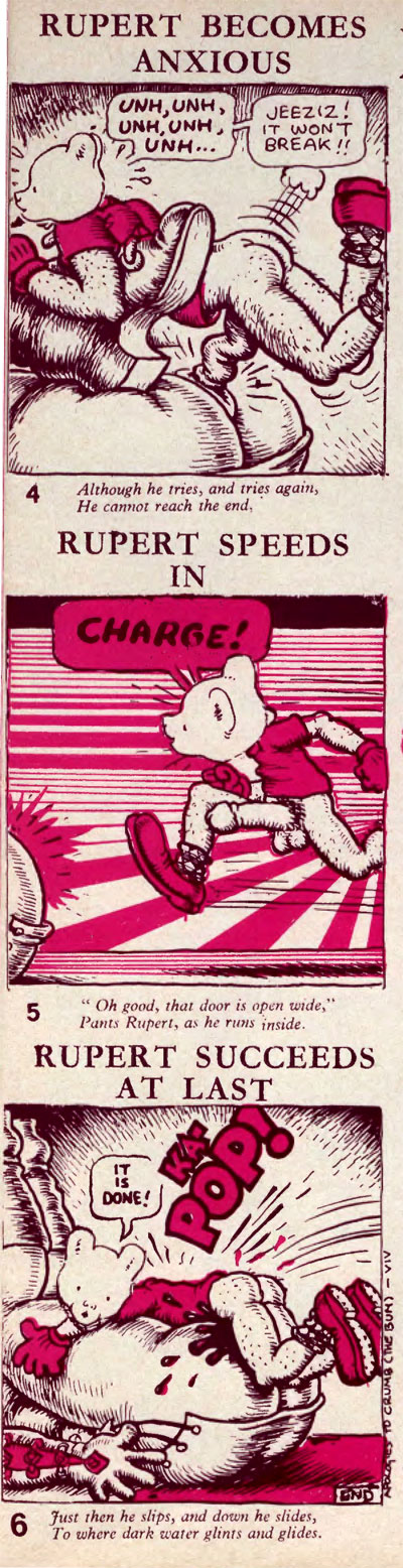 The creator of the objectionable comic was Vivian Berger, who signed with "Viv". Berger didn't draw the strip himself, but created a collage from two different sources. The original sex scene came from Robert Crumb's 'Eggs Ackley Among the Vulture Demonesses', which originally appeared in Big Ass Comics issue #1 (June 1969). Berger cut out Rupert Bear faces from the Rupert Annuals and pasted them on Eggs' face. To make the collage resemble a 'Rupert' story, Berger added descriptive titles above each panel and rhyming verses underneath. The dialogue in Crumb's speech balloons was left unaltered; only the captions were original material. In the final panel of his parody, Berger wrote "Apologies to Crumb (the bum) - Viv".