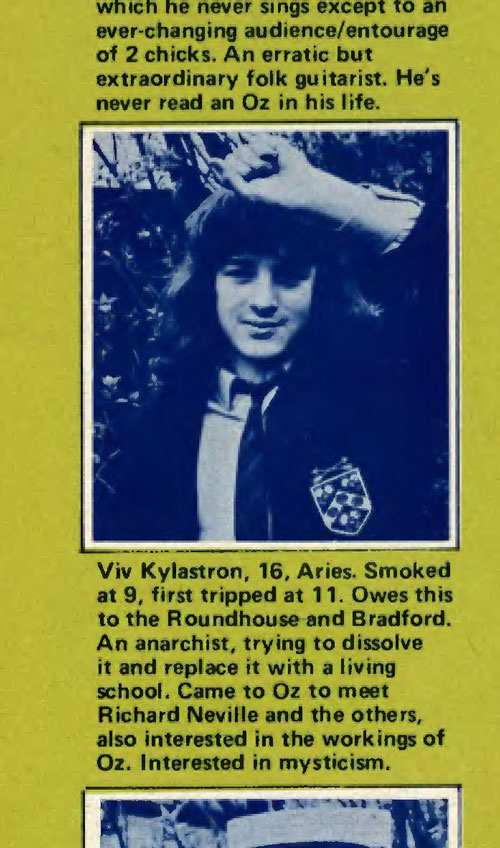 The 'School Kids Issue' also gave some biographical background about Viv Berger. In the Oz blurb, Viv was described as an anarchist with an interest in mysticism, who started smoking at age 9 and took his first LSD trip at age 11. In the issue, he is called "Viv Kylastron" and described as sixteen years old. However, in most of the subsequent articles written about the scandal, Viv Berger was referred to as being fifteen. If Berger was indeed born in June 1955, he was fourteen when contributing to Oz and fifteen during the trial. The official Oz trial court documents mention that Berger lived with his mother and two sisters, age 10 and 12. They lived in a basement flat on Steele's Road in the Belsize Park district of the London Borough of Camden. Allegedly, the house was later bought by Noel Gallagher, member of the rock band Oasis. Gallagher named it "Supernova Heights" and turned it into a scene for social gatherings and raucous parties.