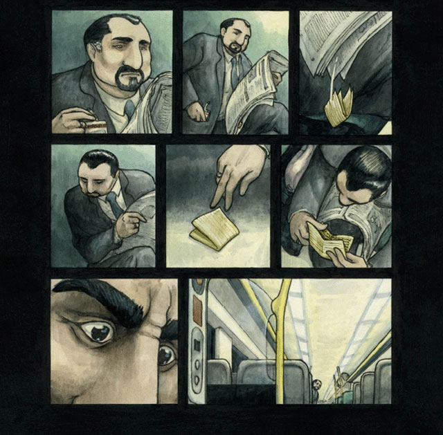 Hannah Berry's next graphic novel, 'Adamtine' (Jonathan Cape, 2012), was also a mystery thriller, but with a darker turn. The story revolves around a mysterious serial killer, the "Postman", who terrorizes the country. Some people suspect Rodney Moon, who nevertheless denies being the notorious criminal. Yet there are strong hints that he is at least familiar with the killer, since he admitted passing on his notes to police inspectors. The plot thickens when Moon disappears. In the light of these events, the story follows four people on a train at night. When the vehicle suddenly breaks down, all other passengers vanish without a trace, leaving the four remaining travelers unsure of their fate. 'Adamtine' received excellent reviews and was praised as a disturbing psychological horror story, something most critics considered difficult to pull off in the comics medium. As a huge fan of the Japanese horror classic 'Ringu' (1998) and Emily Gravett's 'Little Mouse's Big Book of Fears' (Gravett, 2008), the author wanted to make something metafictional, where the medium itself becomes malicious. In some panels, for instance, one can see faces in the darkness watching the characters and also somehow watch the reader.