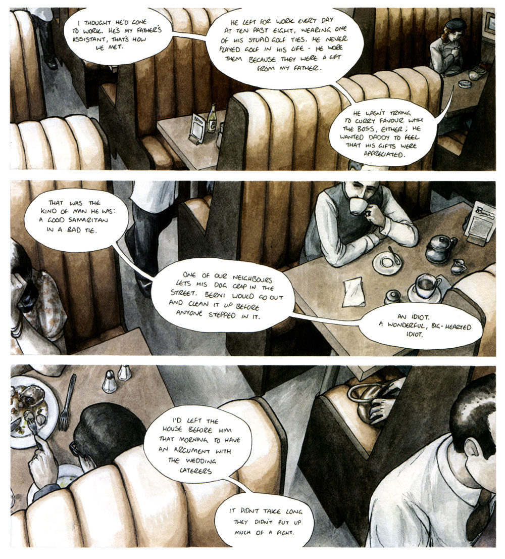 In her spare time, Berry wrote and drew 'Britten & Brülightly' (Jonathan Cape, 2008). The book revolves around an Ecuadorian private detective, Fernández Britten, who feels remorse over spying and tar-and-feathering so many people over the years. He and his sidekick Brülightly try to find salvation by taking on a case which could actually make a positive change, rather than ruin his victim's career. They delve deep into the suicide of a certain Berni Kudos, whose widowed fiancée Charlotte has the feeling there was more to his death than depression. Trying to make a comic book all on her own during after-hours was already a daunting task. Yet Berry even went through a self-described "macho act" by hand-painting every panel. It was a painstaking process, but the end result justified the means. Her atmospheric noir-like tale captivated both readers and critics and was translated into French, Dutch, Italian and Serbian.