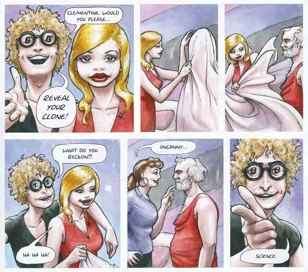 In addition, Hannah Berry contributed to 'Above the Dreamless Dead: World War I in Poetry and Comics' (Duffy et al., 2014), Ravi Thornton's 'Hoax: Psychosis Blues' (Thornton et al, 2014) and Scream! & Misty's 'Halloween Special: Return to the Sentinels' (Berry and Willsher, 2017). For Rebellion Comics, Hannah Berry revived a classic 1978 comic story from Misty magazine ('The Sentinels' by Malcolm Shaw and Mario Capaldi), about a gateway to a terrifying alternate reality where Britain has been occupied by Nazi Germany since 1940. Working with artist Ben Willsher, Hanny Berry wrote the follow-up story 'Return of the Sentinels', which appeared in the 2017 'Scream! & Misty Halloween Special'.