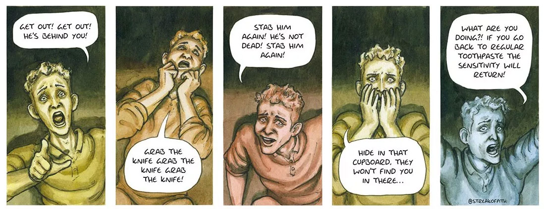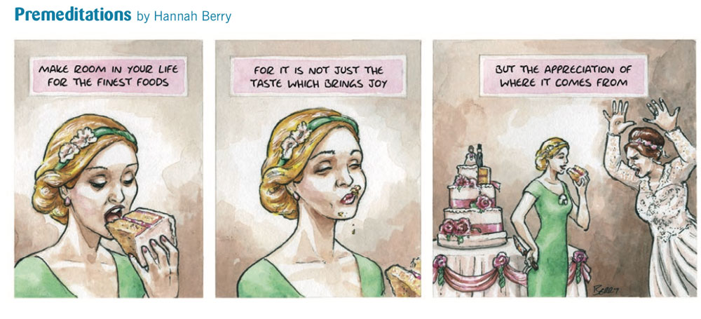 On 31 August 2018, Berry launched her monthly gag comic 'Premeditations' in Prospect Magazine. Just like 'Vox Pop', the comic doesn't feature recurring characters, only different regular people in different situations, most of which involve some kind of revenge on others. The joy of reading 'Premeditations' is trying to figure out how the character will act out his or her premeditated payback. Berry often plays with the situation by stretching it out until the revelation in the final panel. During her tenure with Prospect Magazine (2018-2021), Berry also created another comic feature, 'The Clapham Omnibus'.