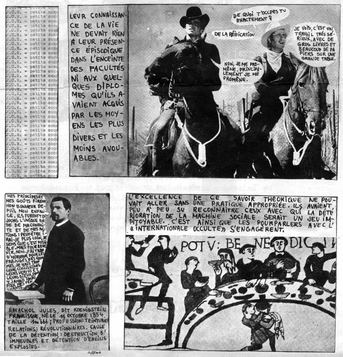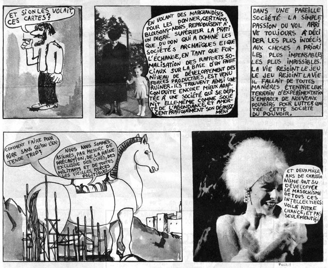 The Durutti Column referred to the anarchist military unit established during the Spanish Civil War (1936-1939). In Bertrand's comic, existing powers were under attack and leftist student protest was voiced. It was made with the "détournement" technique. This was a process of using and contorting images, often well-known drawings and pictures, by adding text balloons and inventing completely new graphic stories around them.