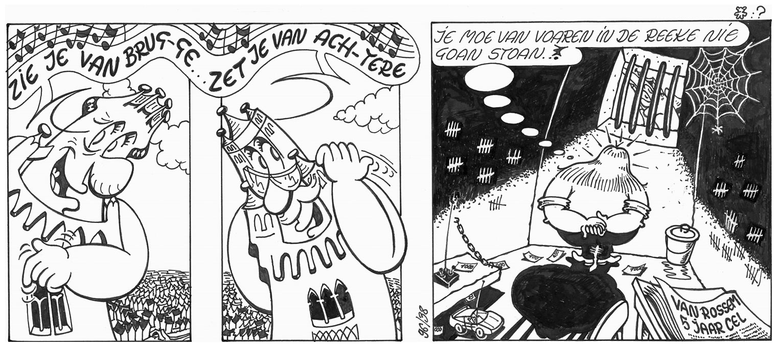 ''t Brugs Hallerietje' (1996). The tower sings Willy Lustenhouwer's song 'Zet Je Vanachter', which invites people from Bruges to "ride along". However, the Bruges-born business guru and convicted fraudster Jean-Pierre Van Rossem can't join in, thinking: "You shouldn't stand in front of the line."