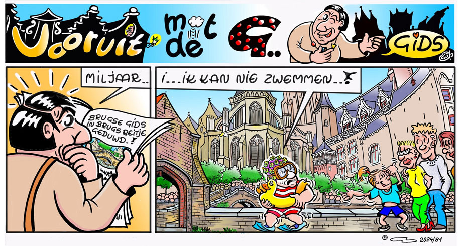 'Vooruit met de G... Gids' (2024). Translation: "Guide from Bruges pushed in Bruges Reie water." - "I...I...can't swim!" In the background the Onze Lieve Vrouwe Kerk ("Church of Our Lady") is depicted.