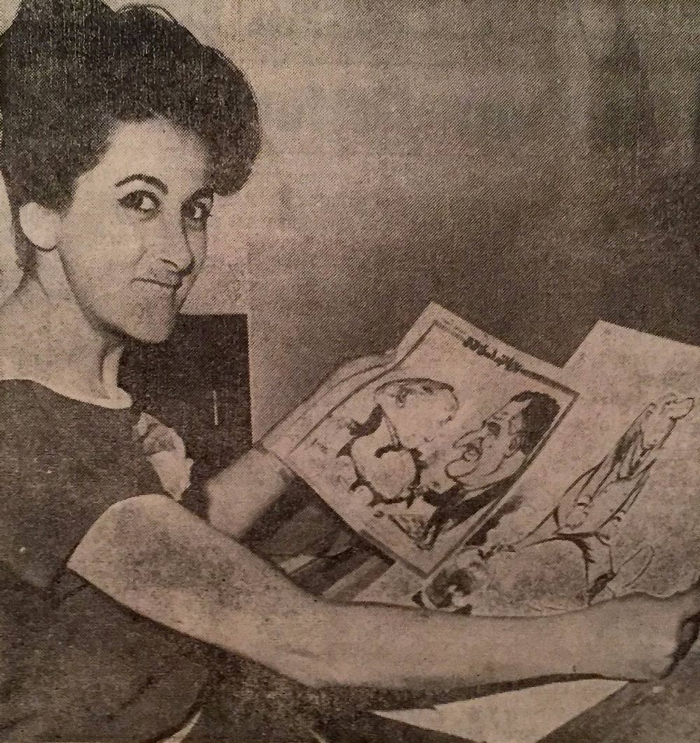 Bhiga, mid-1960s. The politicians caricatured on the page she's holding are German chancellor Ludwig Erhard and Egyptian head of state Gamal Abdel Nasser.