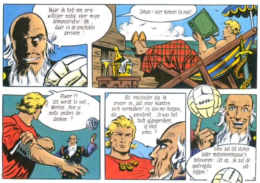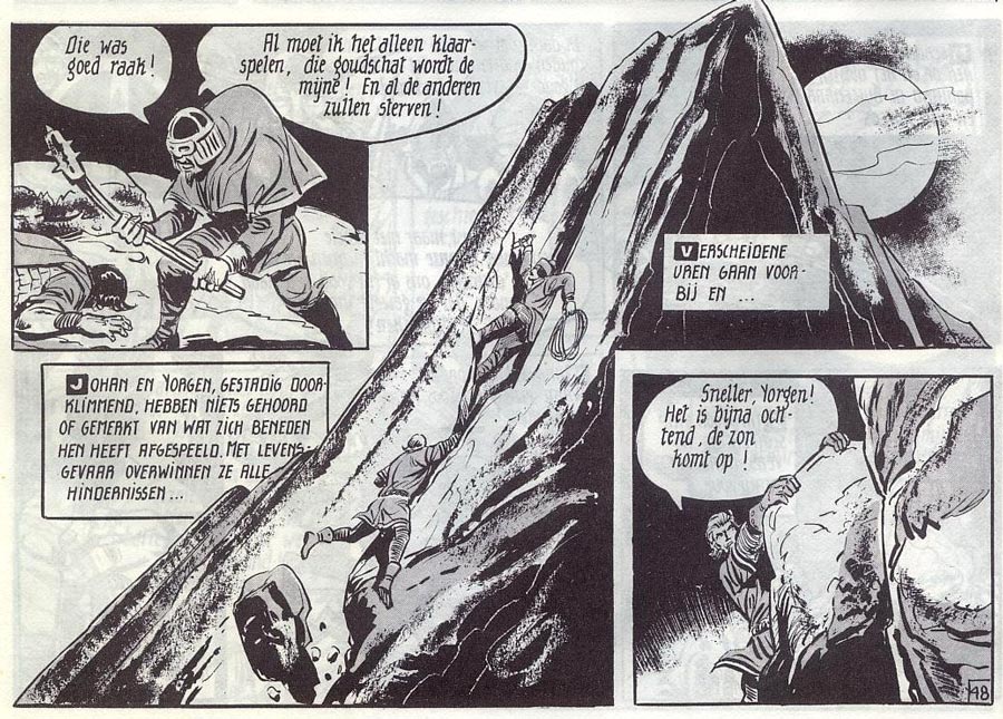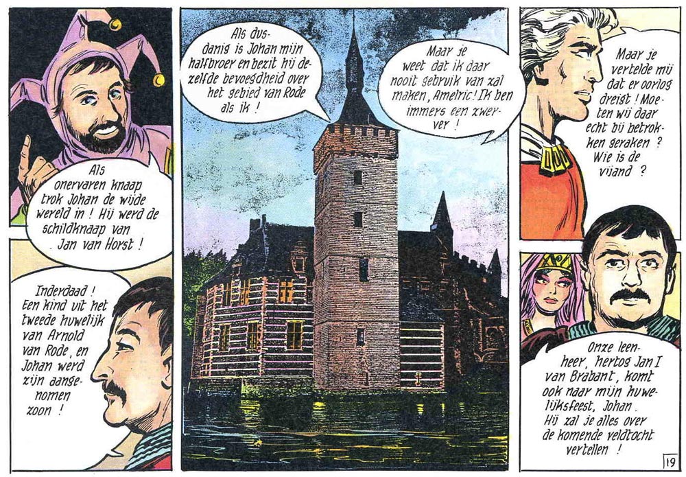 Serialized in De Standaard from 5 November 1959 on, the early stories clearly reveal the influence of Harold Foster's 'Prince Valiant'. Johan is a lonely knight roaming through woods and fields, fighting for justice. Later, he becomes a Knight of the Round Table and serves under King Arthur and Queen Guinevere. The 1964 story 'King Arthur' introduced Merlin the wizard, who remained a regular cast member. During the early years, several of Vandersteen's studio workers participated in the comic's production, including Karel Verschuere, Eduard De Rop and Frank Sels, as well as his son Bob Vandersteen. The constant shift in creators explains why there was no real focus in the character's universe. Some stories take place in different eras of the Middle Ages, often centuries apart from one another. Sometimes the stories are serious in tone, while in other episodes Johan meets dragons, witches, fairies, gnomes and wizards. The knight travels through Continental Europe, but his horse also brings him as far as Scandinavia, Iraq, Cambodia, Korea, China or Japan. But through it all, Vandersteen's storytelling talent shines through. The captivating, suspenseful and overall epic stories helped 'De Rode Ridder' become a bestseller.