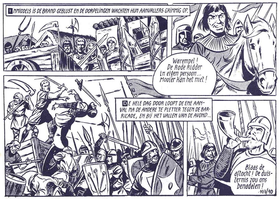 In 1972, 'De Rode Ridder' was briefly removed from the daily newspapers Het Nieuwsblad and De Standaard to make room for Vandersteen's new creation 'Robert en Bertrand'. The noble knight's adventures were transferred to Pats, the weekly children's supplement of both papers. There, Biddeloo had a full page at its disposal instead of two strips. He took the opportunity to drastically change his lay-outs. Inspired by American, British, Spanish and Italian action and horror comics, he changed from the traditional four strips-per-page format to more playful panel lay-outs and larger illustrations. Actions became more dynamic by having hands, legs, swords and arrows jump out of the panel borders. All this gave Biddeloo's work a more three-dimensional, dynamic and lively look, unique in Belgian comics at the time. To speed up production, Biddeloo started to use photocopies of castles, ships or even drawings he used before and pasted the imagery in his panels.