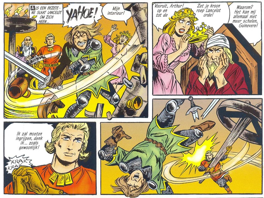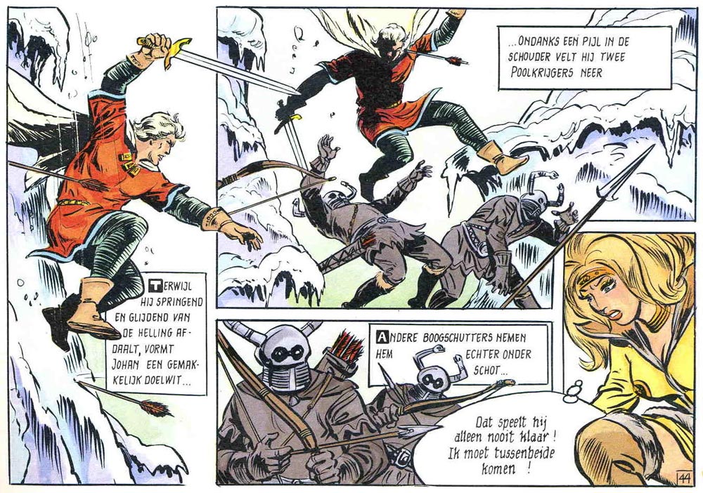 None personified the eroticism better than the characters Galaxa and Demoniah. In many stories they each try to seduce the gullible knight. Johan loves Galaxa, but since she is a fairy, she can never stay in the mortal world for long. Demoniah is a genuine femme fatale. She often exploits Johan naiveté and wraps him around her finger. In 'Gilgamesj' (1986), Demoniah is tied up, teasing Johan to "liberate her". Johan is aware that she is evil and only wants to eliminate him. Yet they feel a mutual attraction and can never bring themselves to kill one another off for good. And thus Johan finds himself in a vicious circle. A platonic ménage-à-trois where two sex bombs have cat fights over him while he struggles to suppress his urges.