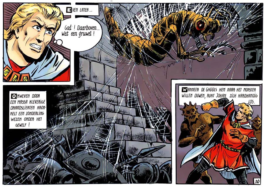 Critics often accused Biddeloo of reducing 'De Rode Ridder' to pulp. Sensational action, horror and eroticism became the comic's major selling point. Several readers felt the series jumped the shark once extraterrestrials and robots were introduced. The endless affairs and catfights between Johan, Galaxa and Demoniah resembled a campy soap opera. Equally ridiculous were the B-movie level monsters, witches, wizards, zombies, gnomes, demons, werewolves, mummies, dragons, vampires and giant beasts. A few verged on silliness, such as fish-faced monster men ('De Koraalburcht', 1972), colossal shrimps ('De Terugkeer', 1971) and a cross between an ant and a caterpillar ('De Maagdenburcht', 1983). Many storylines recycled the same clichés. In his wonderfully funny book 'Geheimzinnige Sterren' (Daedalus, 1996), author Rik Pareit noticed that in Biddeloo's stories, Johan's horse has a tendency of dying once per album. The knight is quite preachy when telling others how they should behave, yet isn't all-knowing either. Time and time again he fails to recognize his enemies when they wear a paper-thin disguise. Another formulaic plot element are arrows hitting characters in the back. Pareit observed that both the action itself as well as the accompanying sentence are always staged the same way. Usually among the lines of: "Suddenly an arrow hits [name] and he crashes down with a raw yell." In fact, cartoonist AAaaRGh... actually derived his pseudonym from a corny yell found in 'De Rode Rider'.
