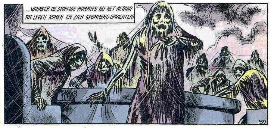Biddeloo was a fan of science fiction too. In 'De Vluchtelingen' (1978) and 'Karpax de Stalen Man' (1978), robots and extraterrestrials appeared in the series, obviously influenced by the success of 'Star Wars'. As movies became gorier and bloodier, 'De Rode Ridder' went along with the times. Rather than draw silly cartoony monsters, Biddeloo gave them creepy designs. Characters were frequently killed off in gruesome ways. Even though the series never became too gory, the macabre atmosphere and violence surprised and shocked several Belgian readers at the time. However, it also appealed to young readers who were pleased to see something else in Belgian children's comics for a change.