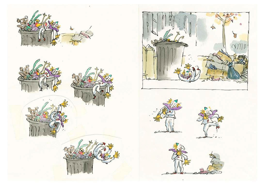 Among the most beloved stories written by Blake are the award-winning 'Mister Magnolia' (1980) and 'Clown' (1998). The first is a story in rhyme about a trumpeter, the second a pantomime picture story about a toy clown who is thrown away with other old toys. He then decides to find a new home for himself and his friends. The 'Clown' story is interesting for comic fans, because Blake often juxtaposes separate images on pages, much like panels in a comic book. Some scenes, like the moment when Clown is thrown out of a window, are sequential illustrations. In interviews, Quentin Blake often expressed fondness for 'Clown', saying he regards it as the work he's most proud of. In 2020, Eagle Eye Drama produced an animated short adaptation of 'Clown', broadcast on Channel 4 as a Christmas Special.