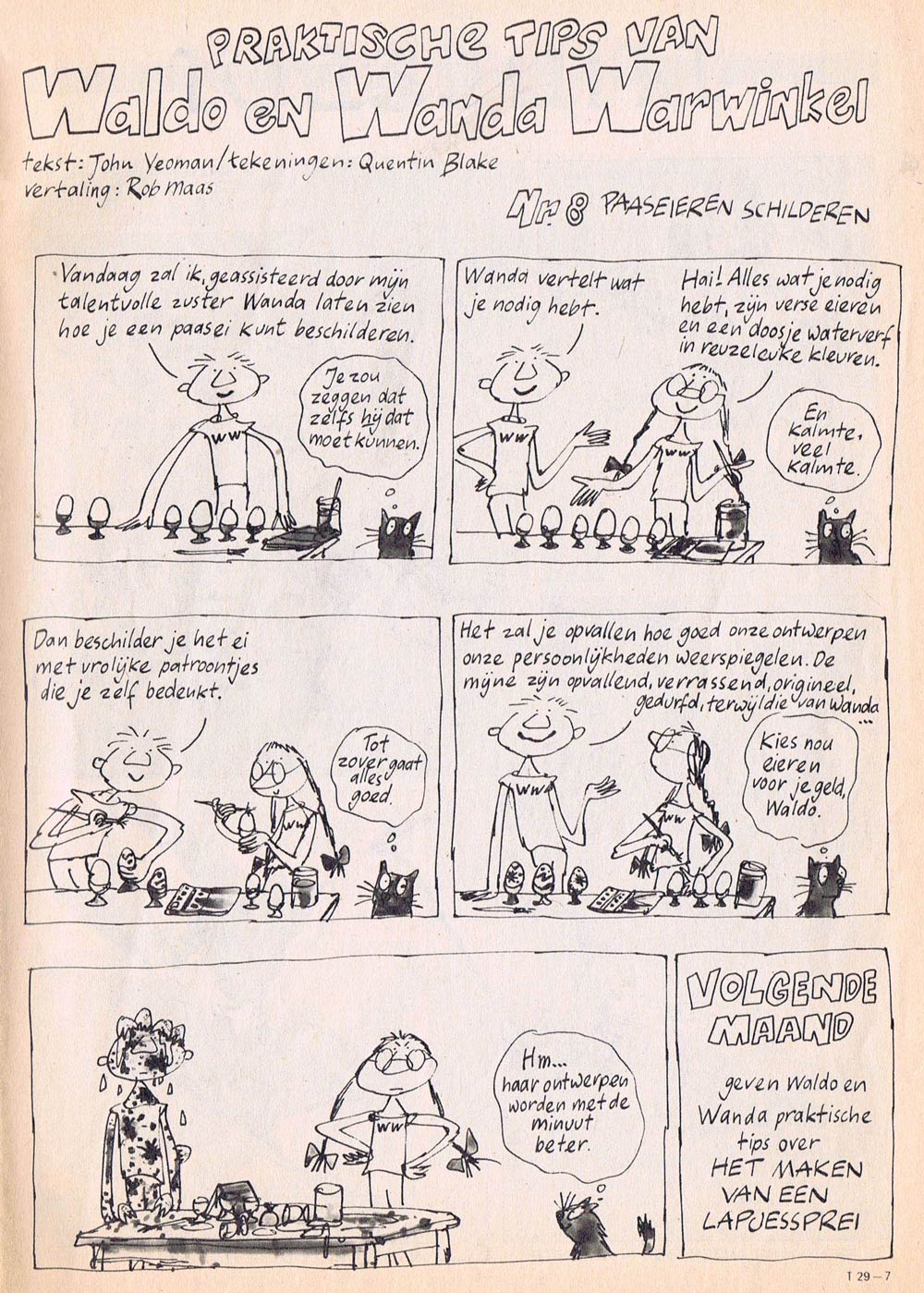 In 1974, Blake became an illustrator for the children's magazine Cricket. His best-known feature in the magazine was the comic strip 'Waldo and Wanda', written by longtime associate John Yeoman. Waldo and Wanda are a brother and sister who give readers practical tips on cooking or handcrafts, although things often go disastrously wrong. In thought balloons, their cat provides commentary on their actions. The series also appeared in Dutch in the children's magazine Taptoe under the title 'Waldo and Wanda Warwinkel'. In 1984, episodes of 'Waldo and Wanda' were compiled into the book 'Crash! The Waldo and Wanda Book of Practical Hints' (Magnet, 1984).