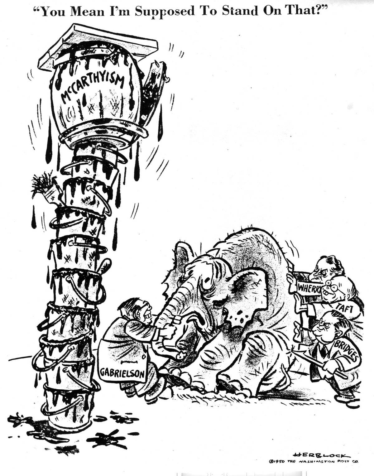 Herblock was one of the first American political cartoonists to fiercely comment on the anti-communist witch hunt of senator Joseph R. McCarthy. He portrayed him as a shady, paranoid, unshaven manipulative fraud who caused more harm than good. In one famous 1950 cartoon, Herblock drew the Republican Party elephant being dragged towards an unstable tower of tar and feather which reads "McCarthyism". The pachyderm is concerned that he has "to stand on THAT?". The cartoon made 'McCarthyism' a household word to describe the senator's ideology. Today, the 1947-1954 era is still often referred to as "the McCarthyism years", while similar politicians who use witch hunt tactics have been labeled "McCarthyists" ever since. McCarthy wasn't pleased with this portrayal and called Herblock out in a speech. He even started shaving twice a day to avoid being caricatured in this unflattering manner.