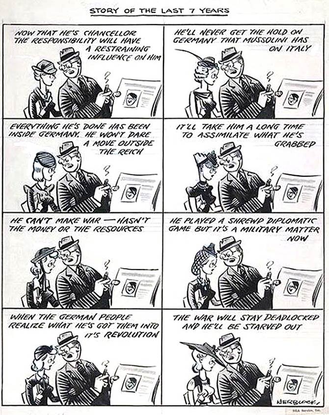 The early 1930s brought Herblock to Cleveland, where he drew exclusively for the NEA syndicate. Curiously, as the decade continued, Herblock grew more progressive while the syndicate became increasingly conservative. He specifically stood out by criticizing the isolationist policies of the Monroe doctrine, while his newspaper defended a neutral stance regarding Hitler and Mussolini's warmongering in Europe and North Africa. By the late 1930s, the syndicate shrank the size of his cartoons, and begrudgingly waited out the term of his contract. Even when World War II broke out and the United States joined the conflict, his editors still felt his cartoons were "too extreme". In 1942, Herblock was called to New York City to meet the head of NEA. They planned to reprimand him, but that very same day they were informed that Herblock had won the Pulitzer Prize for Editorial Cartooning! Suddenly he was their darling again. Nevertheless, Herblock took the opportunity to leave the syndicate and join the Washington Post instead. Soon after he signed up for military service. After World War II he rejoined the Washington Post, where he stayed for the rest of his 74-year career, winning his second Pulitzer in 1954 and the third in 1979. From 1987 until his death, his cartoons were syndicated by the Creators Syndicate.