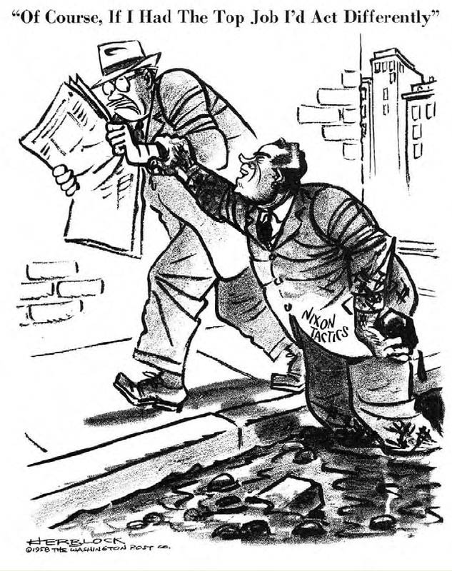 Another shady politician with a "five o'clock shadow" stubble who hated Herblock was Richard Nixon. In 1958 Herblock drew Vice President Nixon crawling out of a sewer, using literal smear tactics. The politician felt so insulted that he withdrew his subscription to the Washington Post and added Herblock to his infamous and ever-growing "Enemies List". In a later interview for the Washington Post with Chad Roberts, Nixon nevertheless claimed that he considered Herblock "really terrific". He said that he didn't want to buy the paper to avoid his daughters seeing Herblock's portrayal of him. During his 1960 presidential campaign he tried to present a more gentle image of himself, confessing to his advisors: "I have to erase the Herblock image first."