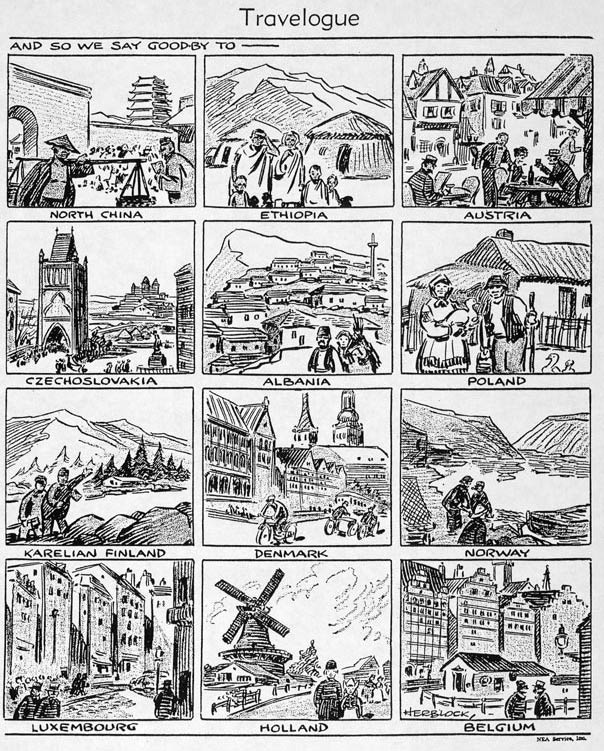 Cartoon commenting on Hitler, Mussolini and Tojo's invasion of all these countries between 1938 and 1940.