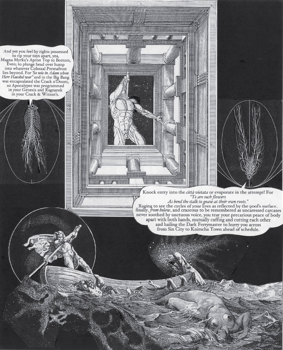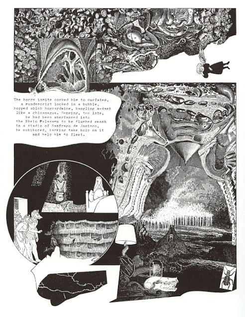 In 1973, Blok made his graphic novel the focus his creative efforts, but at that point, completion was still over forty years away. At the beginning, Blok had no clear story in mind, but his knowledge and interest in the history of humanity's attempts to communicate through pictures soon emerged as the book's dominant theme. It took nearly half a century before the world got a chance to see Blok's finished story in print: on 16 April 2016, Toronto-based Oloris Publishing released the first edition 'The Iron Parachute'. The 346-page book features 25 dreamlike scenes in a loosely connected narrative, comprised of highly experimental black-and-white pen and ink drawings and collage. A strongly visual work, each chapter of 'The Iron Parachute' features a different layout. Some pages have no dialogue, while others have a strong interplay of text and image.