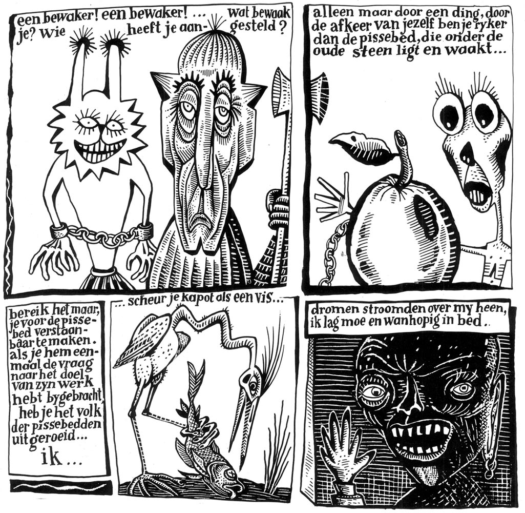 Bodoni's more adult work was collected for the first time in 'Twee Alfredo's Op Een Groene Prairiewolf' in 1986. Bodoni also made bookcovers, graphic design, logo-types, affiches and much more. "De Verschrikkelijke Bodoni" has been making art all of his life, which is shown from time to time.