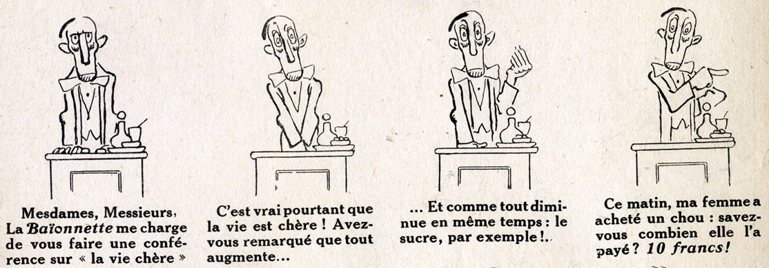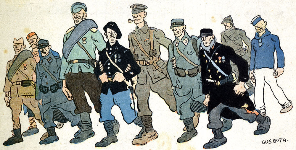 When the First World War started, Bofa was sent to the battlefields as an artist. His assignment was to make an artist's report of the acts of war. He nearly lost his leg in December 1914, and returned to Paris and started working for the satirical war magazine La Baïonnette. He made several comics and illustrations, such as 'Chez les Toubibs', which relates to his stay in the army hospital. His work eventually turned to anti-war propaganda, and still stays notable for its historical and artistic value.