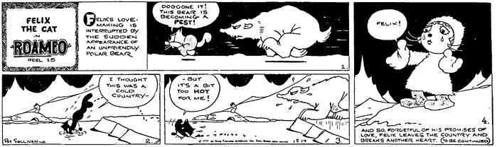 In the 1920s, Bogle was employed by the animation studio of Pat Sullivan, working on the 'Felix the Cat' series. Interviewed by Marcy Springer for The Desert Sun (1977), Bogle claimed he was the one who came up with the idea of launching a 'Felix the Cat' newspaper comic. True or not, it was Otto Messmer who from 1923 on drew the first 'Felix the Cat' comics, though only as a Sunday comic. Bogle does deserve credit for being the first daily 'Felix the Cat' newspaper comic artist, drawing the feature from May 1927 until 1931. These early installments were adaptations of the animated shorts, and supposedly they often consisted of cut-and-pasted or re-inked animation stills.