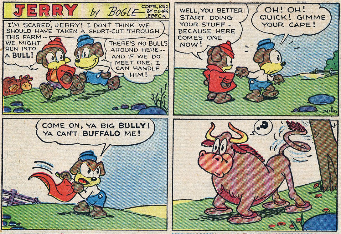 Filler comic strip from Dell's New Funnies #66 (1942). The comic book was otherwise filled with comics starring characters from Walter Lantz cartoons, but this one has a copyright notice for Oskar Lebeck, the managing editor of Western Publishing.