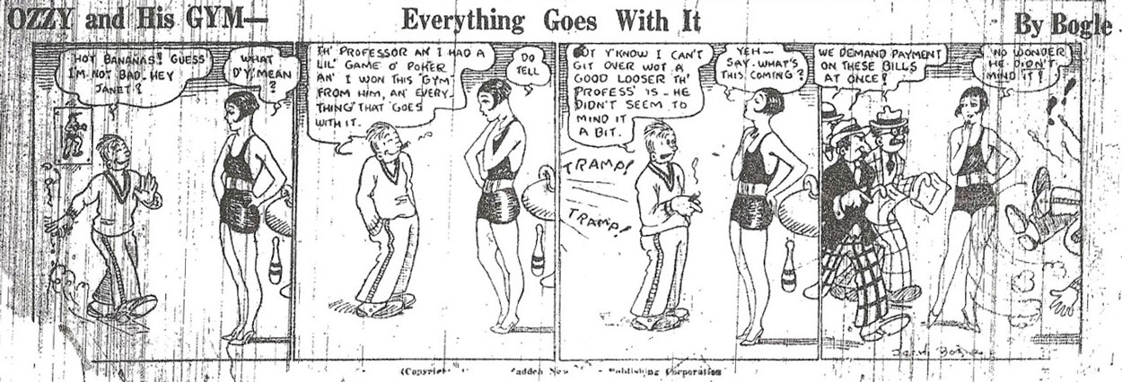 Another daily comic strip by Jack Bogle was 'Ozzy And His Gym' (1924-1925), syndicated by McFadden Publishing. The title character is a gym coach who isn't really interested in helping people stay fit. He takes far more delight in his young, attractive female customers, of which the pretty Janet (sometimes named Mabel) and her short, chubbier friend Kewpie are the other recurring cast members. Ozzy often makes a fool out of himself or gets into witty trouble.